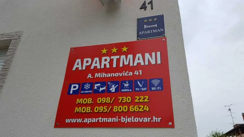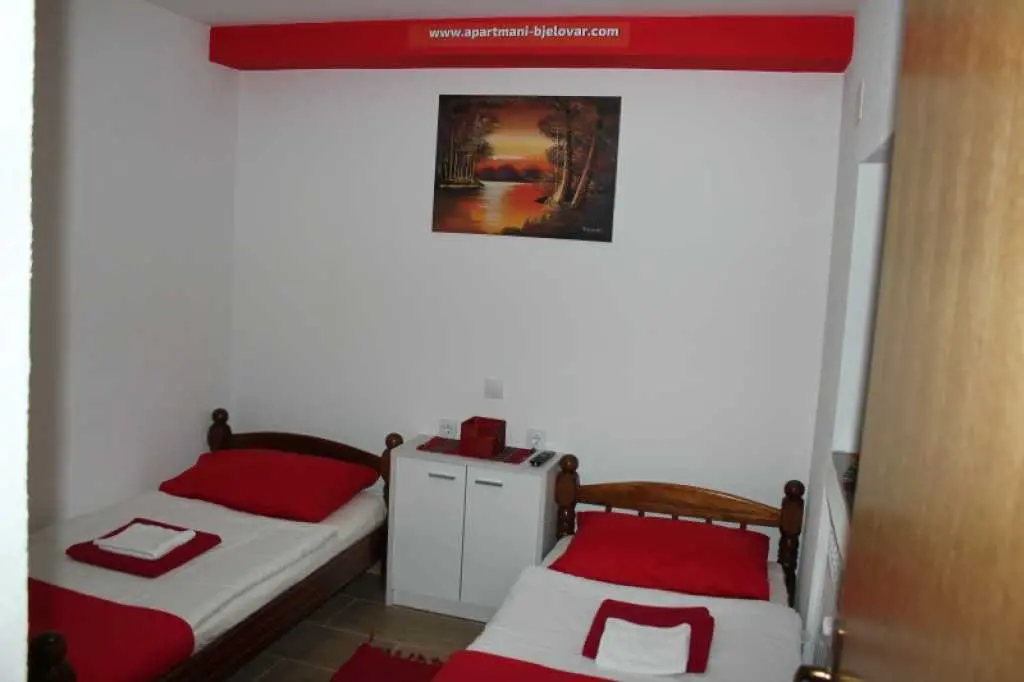 Apartamenty znajdują się w pierwszej strefie miasta, przy ulicy A. Mihanovica 41. Mamy 2 apartamenty. Apartament 1 ma około 65 m2, sprawiają, że dwie sypialnie, pokój dzienny, kuchnia i łazienka z WC i korytarz. Apartament 2 jest 32 m2 składa się z salonu z aneksem kuchennym oraz sypialni i łazienki z WC. Apartamenty są klimatyzowane. W każdym pokoju i salonie znajduje się telewizor. W hotelu dostępny jest bezprzewodowy Internet przez WiFi. Apartament 1 ma 4 łóżka + 2 dostawki. Apartament 2 z 2 łóżkami. Miasto Bjelovar znajduje się na płaskowyżu w południowej części Bilogora (North West Chorwacja) na 135 metrów nad poziomem morza. Bjelovar jest siedzibą Bjelovar County, ale naturalne, kulturowe i polityczne centrum regionu. Miasto Bjelovar zajmuje łączną powierzchnię 191,9 km2 i administracyjnie obejmuje 31 osiedli. Dziś obszar ma około 42.000 mieszkańców. Witamy, miłe wakacje !!