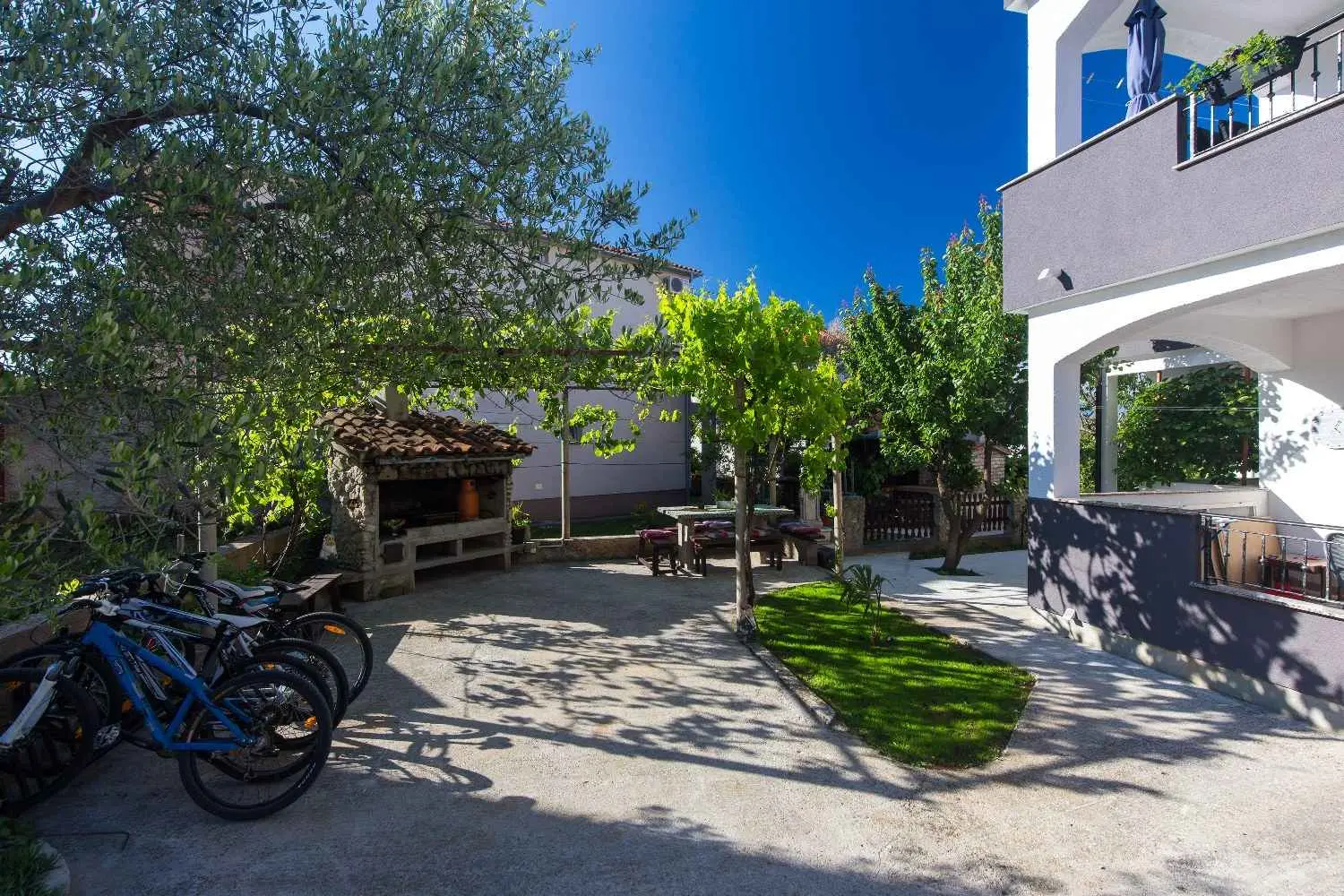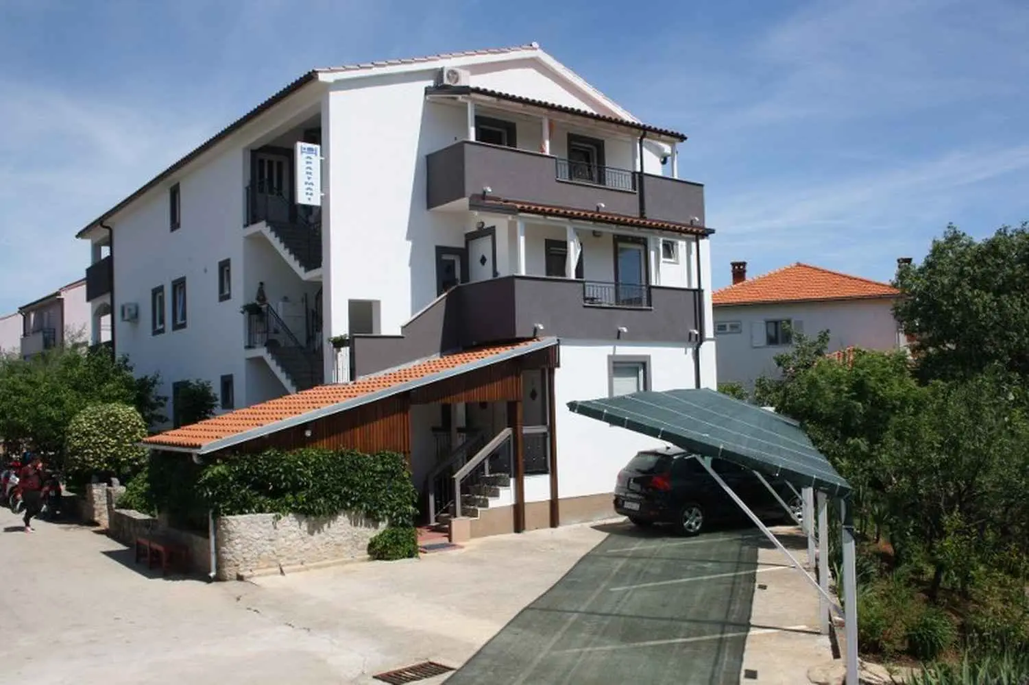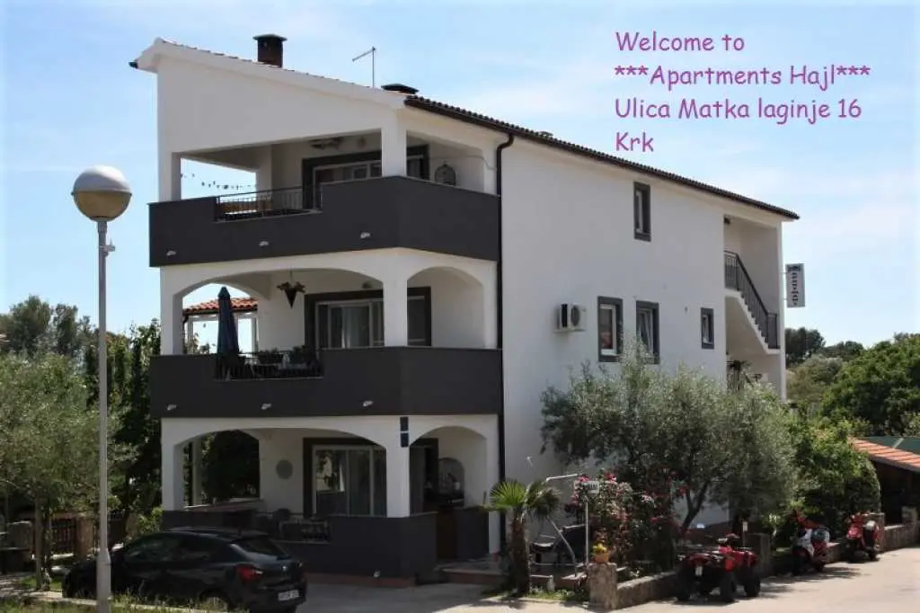 Dom apartamentowy Hajl znajduje się w miejscowości Krk, tylko 400 m od plaży i centrum miasta, a jednocześnie w spokojnej okolicy. Obiekt nadaje się na przyjemne rodzinne wakacje, ponieważ znajduje się przy wyłączonej z ruchu ulicznego. Oferujemy zakwaterowanie w 5 apartamentach, które mogą pomieścić od dwóch do pięciu osób. Apartamenty są w pełni wyposażone i klimatyzowane, aby zapewnić naszym gościom komfortowy pobyt. Każdy apartament posiada własne miejsce parkingowe, a w ogrodzie możliwość korzystania z grilla. Dodatki (płatne po przyjeździe): - Opłata rejestracyjna: 4 € za osobę jednorazowo - Dodatkowe łóżko: 14 € dziennie - Zwierzęta domowe: 12 € dziennie