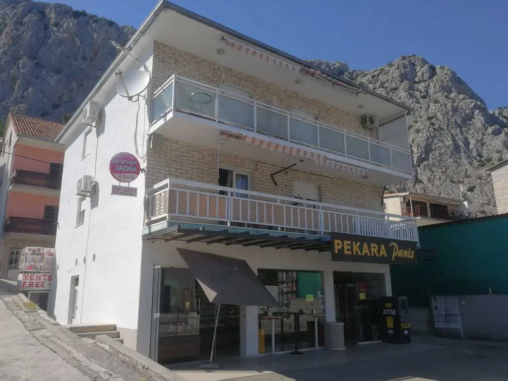 Apartamenty Jadra Omiś znajdują się w bardzo dobrej lokalizacji naszego miasteczka. Wszystko czego potrzebujesz jest pod ręką i w promieniu 50-100m od domu (restauracja, caffe bary, fast food, supermarket, sklep mięsny, centrum handlowe, stadion, plac zabaw dla dzieci, luna park, 3 banki itp.) 2 dwupokojowe apartamenty (2 klimatyzowane i 2 łazienki, 80 m2 i 1 małe studio dla dwóch osób z klimatyzacją). W mielonej mące domu znajduje się bankomat i piekarnia z lodami oraz miejsca parkingowe. Bardzo duża i ładna piaszczysta plaża oddalona jest o około 250 m. Obok plaży znajduje się publiczny basen i restauracja. Omis to femous nad rzeką Cetina, perła o wyjątkowej naturze z wieloma zajęciami sportowymi (surfing, rafting) i słynną tyrolką na górze Mosor w kanionie rzeki. Codzienne wycieczki na wyspy Hvar i Brac z cenaru miasta. Cieszymy się na Państwa wizytę i przyjemny pobyt w naszym domu. Witamy, Apartamenty Jadra Omiś!