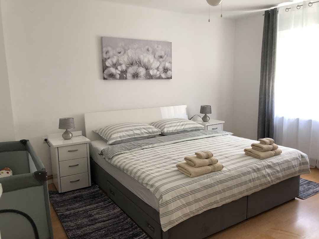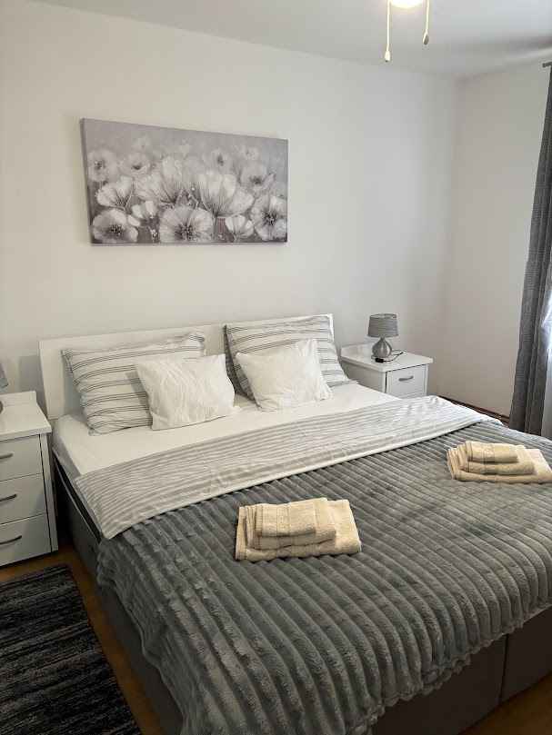 Apartament znajduje się na drugim piętrze w budynku mieszkalnym blisko centrum, w spokojnej okolicy. Wejście do budynku jest zabezpieczone kodem, a do apartamentu mamy pojemnik z kluczem, również na kod. Dwa pokoje: sypialnia z dużym łóżkiem king-size i łóżeczkiem dziecięcym oraz salon z łóżkiem rozkładanym do wymiarów 160x200. Jadalnia z dużym stołem i lodówką, kuchnia ze wszystkim, czego potrzebujesz na dłuższy pobyt bez piekarnika, oraz łazienka ze wszystkimi niezbędnymi sprzętami. Z kuchni można wyjść na mały balkon, a z salonu na większy, gdzie palenie jest dozwolone, ale w pokojach nie jest dozwolone. Apartament posiada centralne ogrzewanie z grzejnikami, klimatyzację, bezpłatny i nielimitowany internet oraz wszelkie instrukcje dotyczące korzystania z telewizora, parkingu, oświetlenia... Akceptujemy małe zwierzęta domowe, które są przyzwyczajone do mieszkania. Jeśli potrzebujesz spokoju i relaksu, skontaktuj się z nami, szczególnie mile widziane są osoby z rodzinami, które przestrzegają zasad panujących w domu.