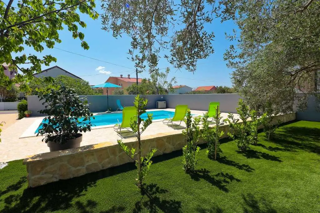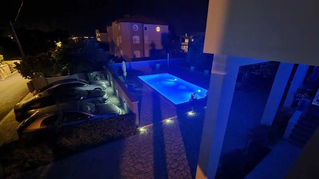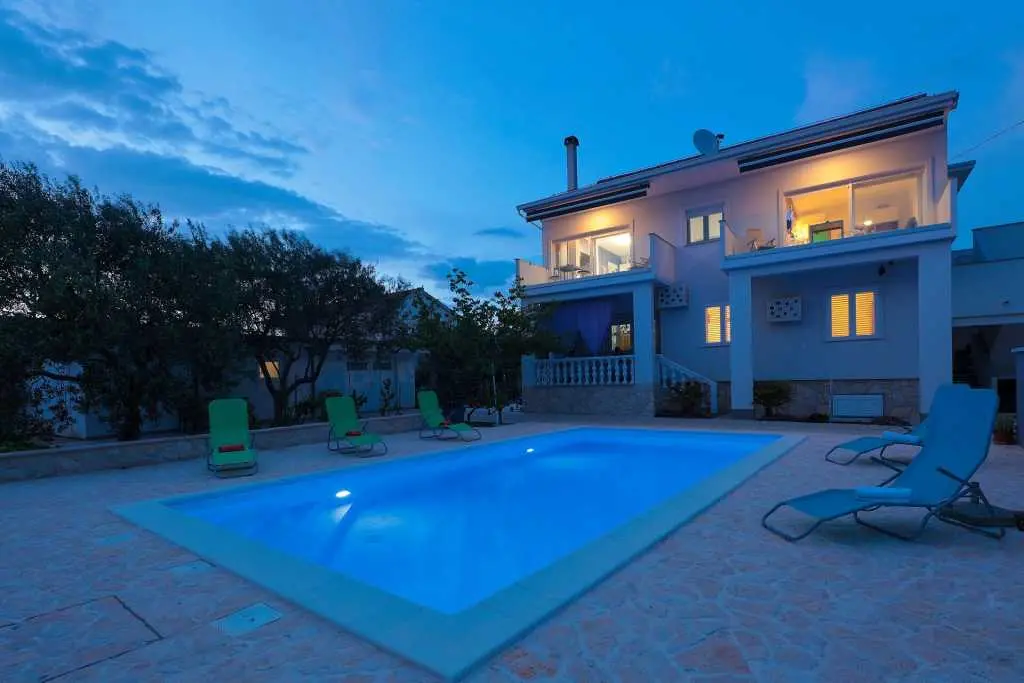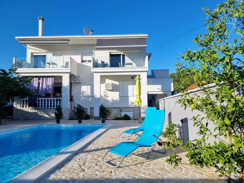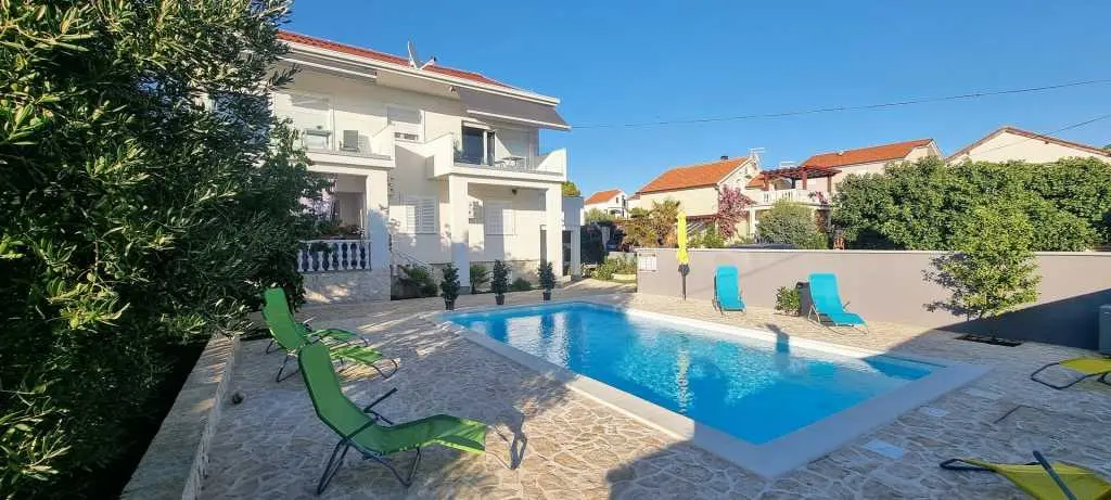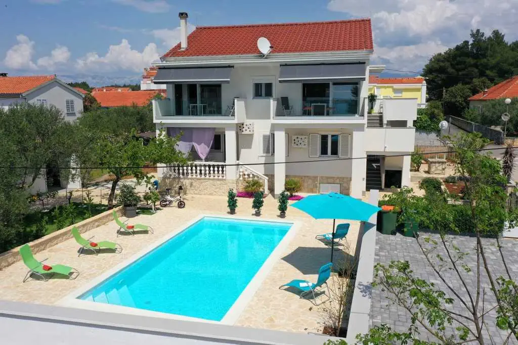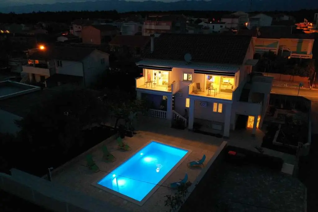 Nasz dom położony jest w bardzo pięknej i bardzo spokojnej okolicy, w malowniczej wiosce Vrsi. Piękny krajobraz, piękna przyroda, ciekawa kultura i zdrowy klimat to cechy, które wyróżniają nas na tle innych miejsc. Główna plaża znajduje się bardzo blisko naszego domu i można do niej dotrzeć krótkim spacerem (80 metrów lub 2 minuty spacerem). W domu znajdują się dwa nowoczesne apartamenty wybudowane w 2019 roku. Większy apartament „Alan 3” ma 4 gwiazdki i jest idealny dla dużych rodzin do 6 osób, natomiast mniejszy apartament „Alan 2” z 3 gwiazdkami przeznaczony jest dla rodzin do dwóch osób dzieci lub może stać się romantycznym rajem dla zakochanych par. Każdy apartament posiada balkon z widokiem na piękną zatokę i duży podgrzewany basen otoczony z jednej strony pięknie zagospodarowanym ogrodem z kwiatami i owocami cytrusowymi, a z drugiej małym gajem oliwnym, który zapewnia przyjemny cień w gorące letnie dni. Taras z miejscami do siedzenia zapewnia relaks w ciągu dnia i letnich wieczorów. Apartamenty są luksusowo wyposażone w inwerterowe klimatyzatory Mitsubishi w każdym pokoju, duży telewizor przekątnej ze wszystkimi programami satelitarnymi (SkyLink, Canal Digitaal, Movistar, Sky DE, Antiksat, Orangesat, Polsat, Mediaset itp.), Netflix, nowoczesną kuchnię z indukcją płyta grzewcza, łazienki z kabiną prysznicową, duża nowoczesna markiza balkonowa otwierana i zamykana na prąd, a w dużym apartamencie „Alan 3” znajduje się biurko z monitorem 4K o dużej przekątnej.