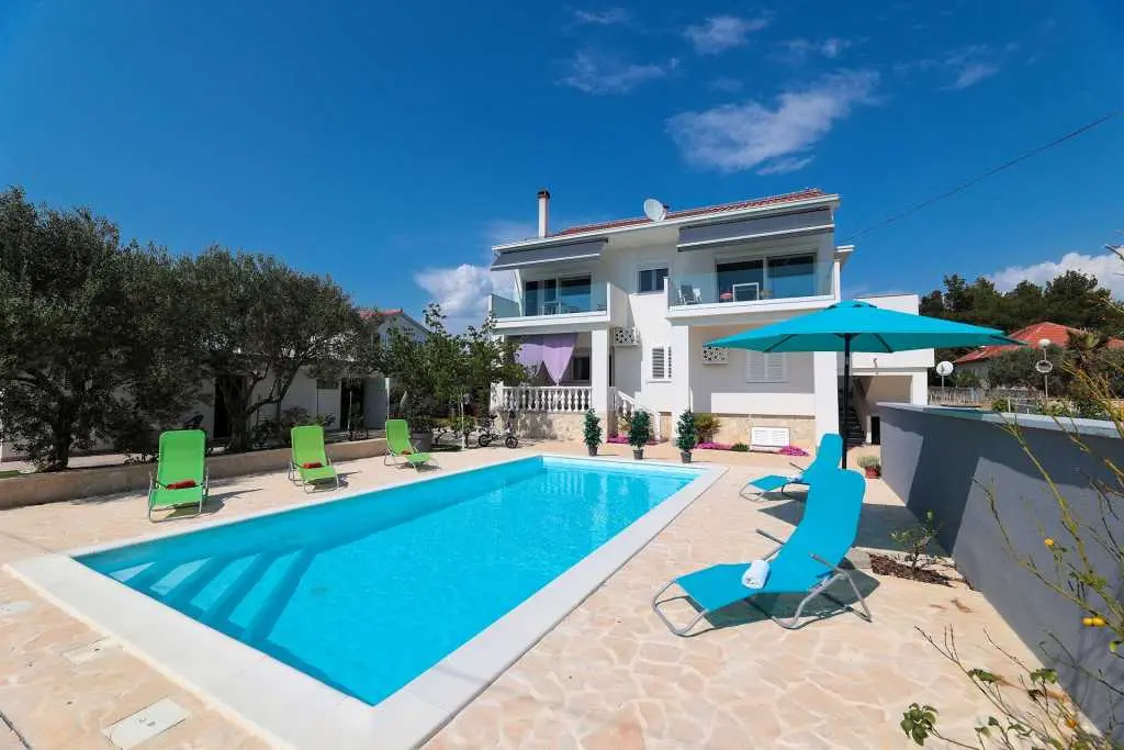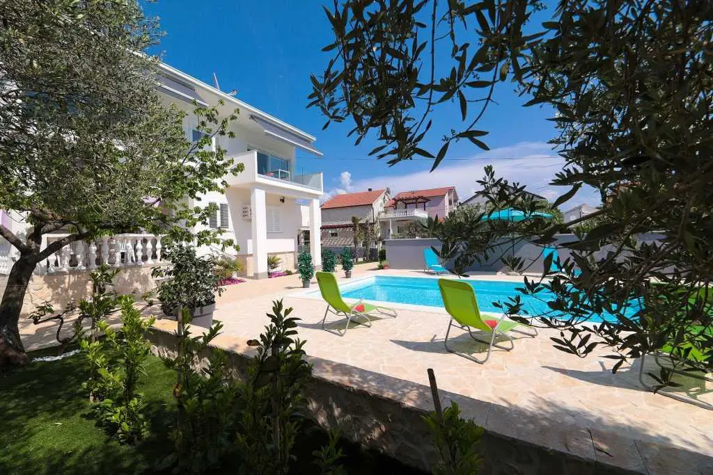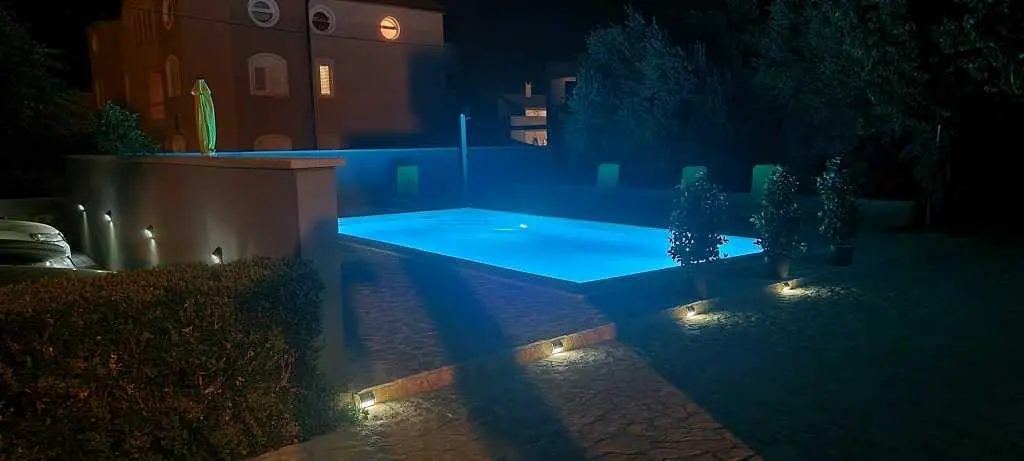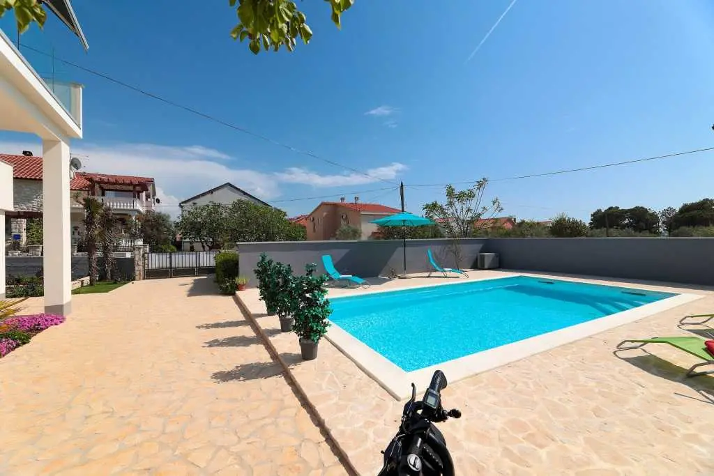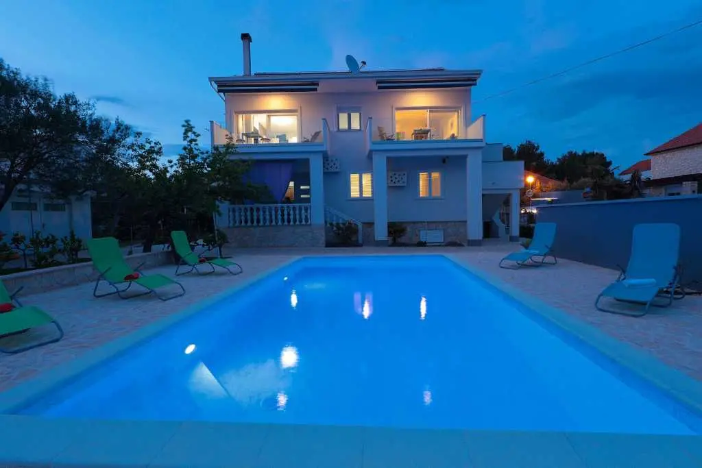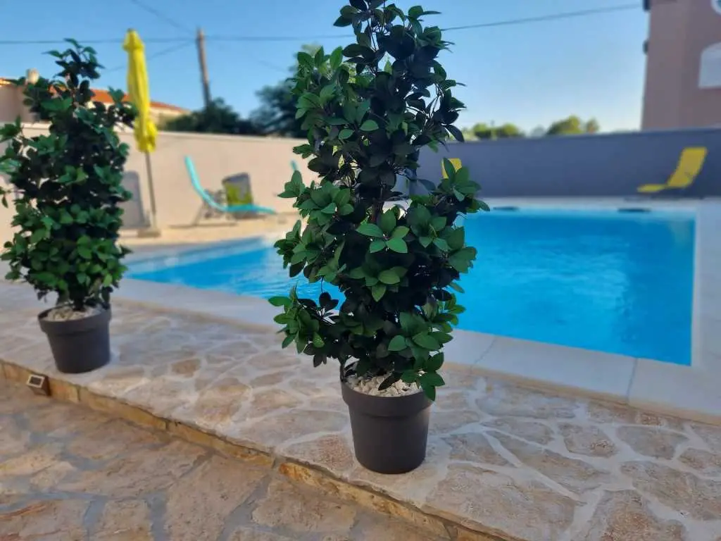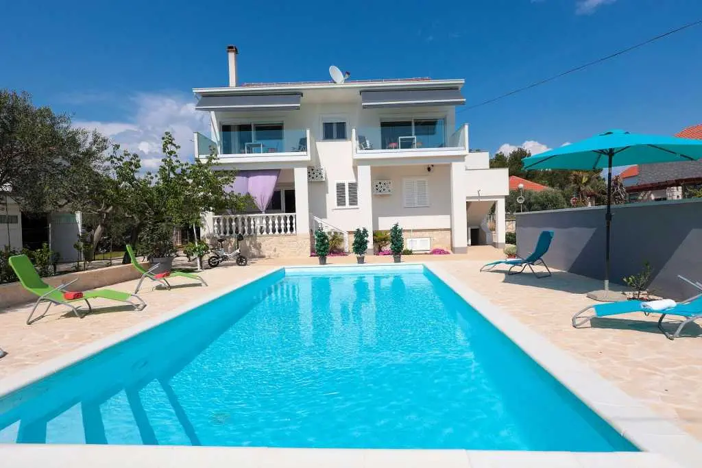 Nasz dom położony jest w bardzo pięknej i bardzo spokojnej okolicy, w malowniczej wiosce Vrsi. Piękny krajobraz, piękna przyroda, ciekawa kultura i zdrowy klimat to cechy, które wyróżniają nas na tle innych miejsc. Główna plaża znajduje się bardzo blisko naszego domu i można do niej dotrzeć krótkim spacerem (80 metrów lub 2 minuty spacerem). W domu znajdują się dwa nowoczesne apartamenty wybudowane w 2019 roku. Większy apartament „Alan 3” ma 4 gwiazdki i jest idealny dla dużych rodzin do 6 osób, natomiast mniejszy apartament „Alan 2” z 3 gwiazdkami przeznaczony jest dla rodzin do dwóch osób dzieci lub może stać się romantycznym rajem dla zakochanych par. Każdy apartament posiada balkon z widokiem na piękną zatokę i duży podgrzewany basen otoczony z jednej strony pięknie zagospodarowanym ogrodem z kwiatami i owocami cytrusowymi, a z drugiej małym gajem oliwnym, który zapewnia przyjemny cień w gorące letnie dni. Taras z miejscami do siedzenia zapewnia relaks w ciągu dnia i letnich wieczorów. Apartamenty są luksusowo wyposażone w inwerterowe klimatyzatory Mitsubishi w każdym pokoju, duży telewizor przekątnej ze wszystkimi programami satelitarnymi (SkyLink, Canal Digitaal, Movistar, Sky DE, Antiksat, Orangesat, Polsat, Mediaset itp.), Netflix, nowoczesną kuchnię z indukcją płyta grzewcza, łazienki z kabiną prysznicową, duża nowoczesna markiza balkonowa otwierana i zamykana na prąd, a w dużym apartamencie „Alan 3” znajduje się biurko z monitorem 4K o dużej przekątnej.