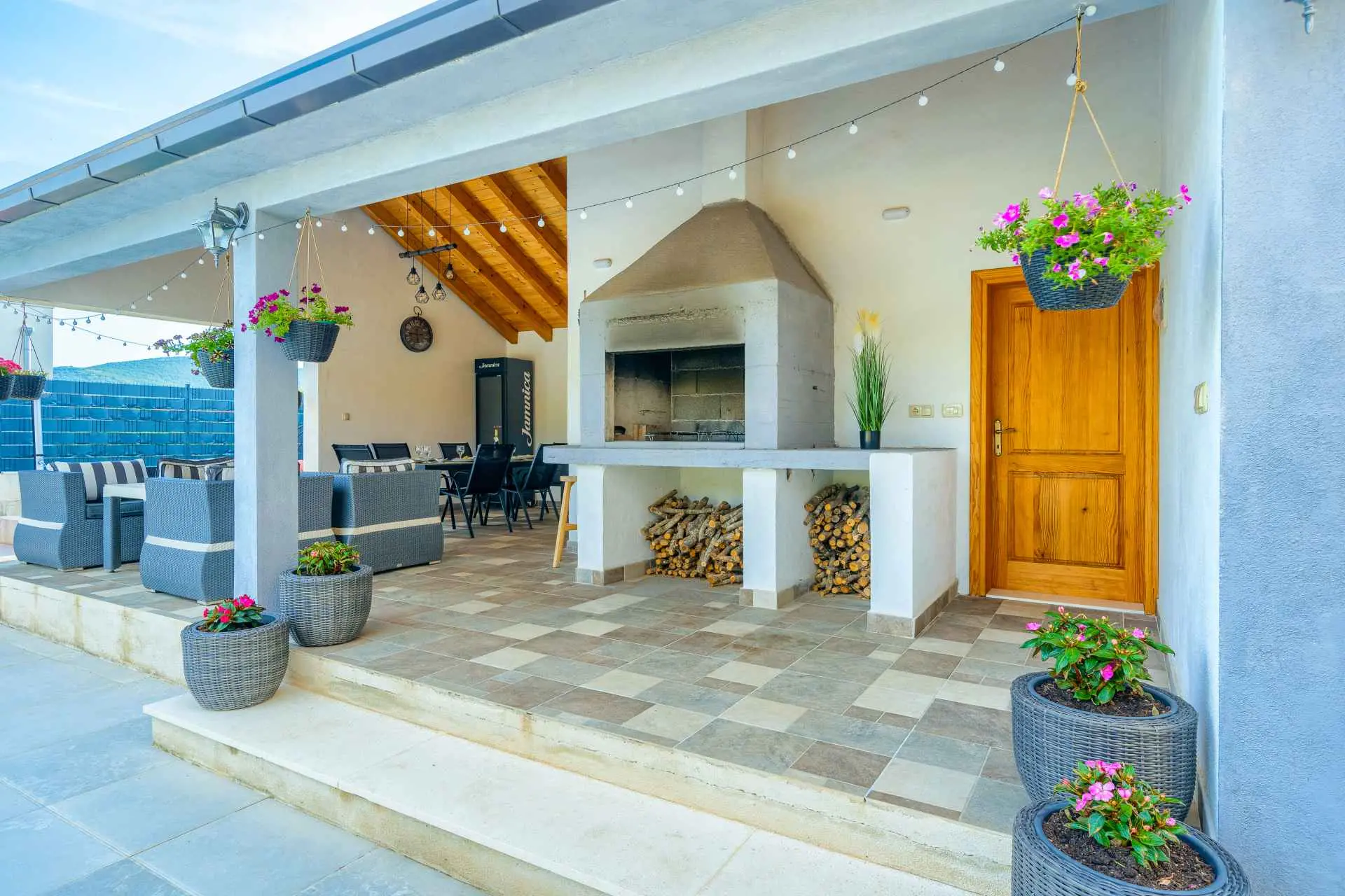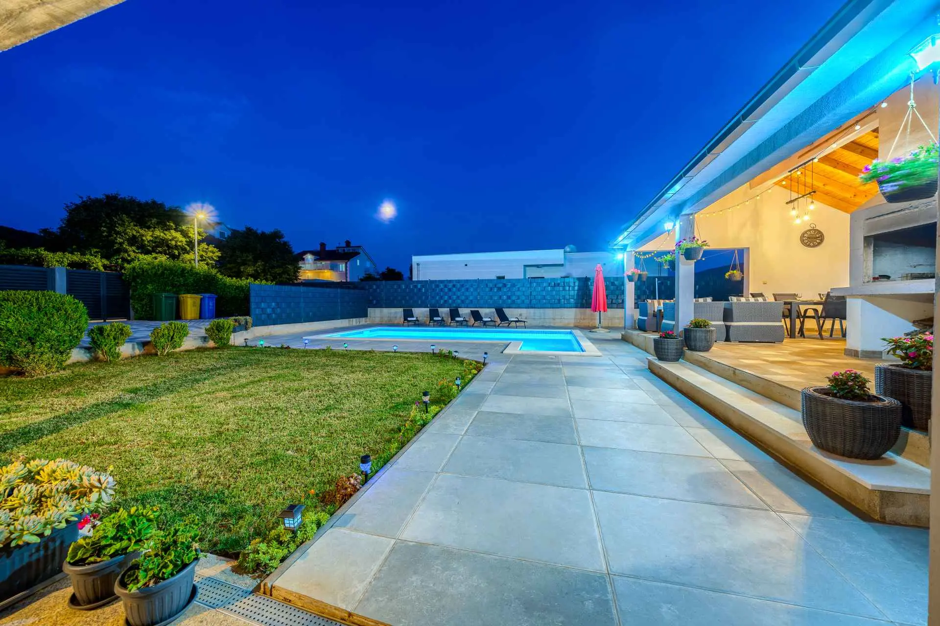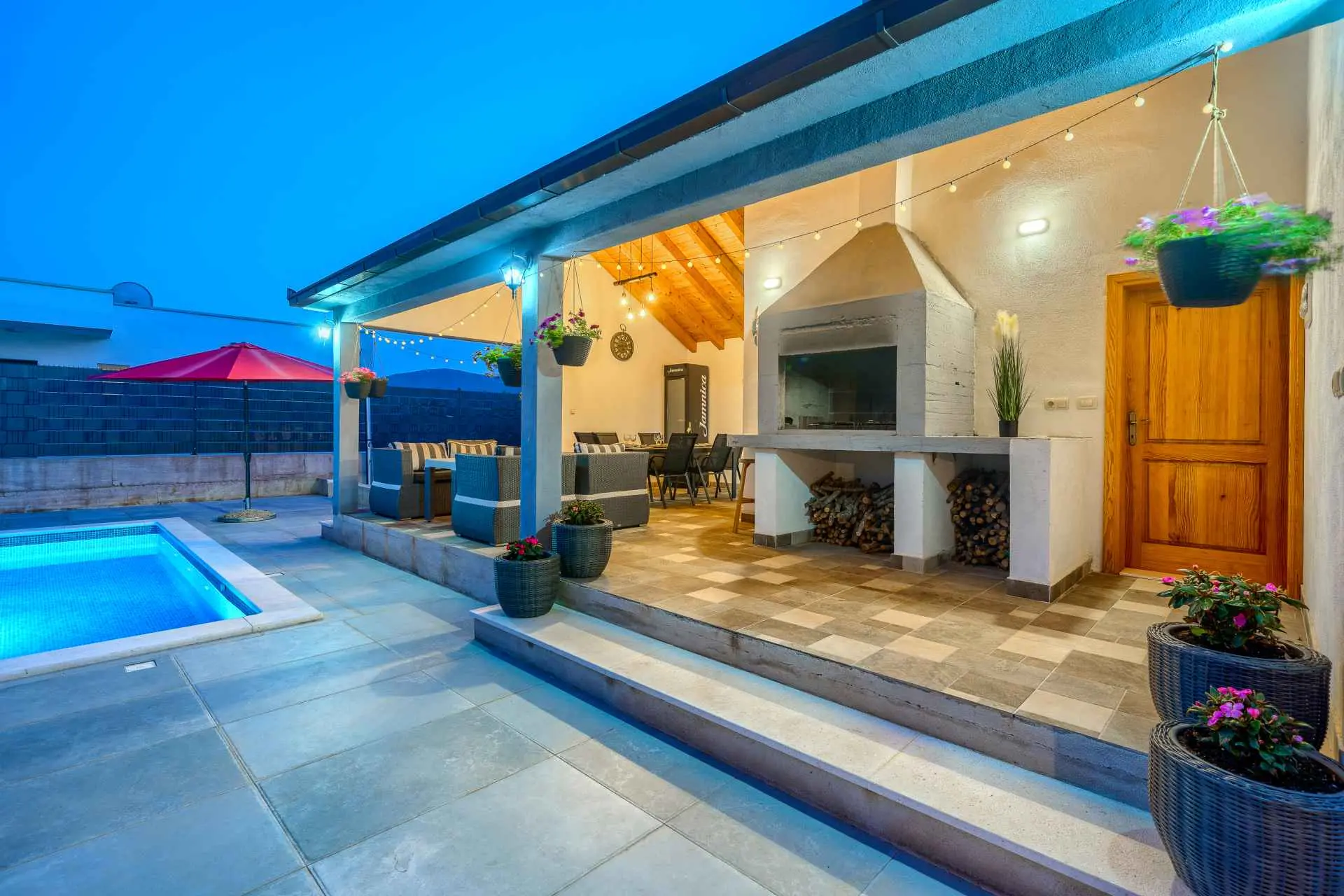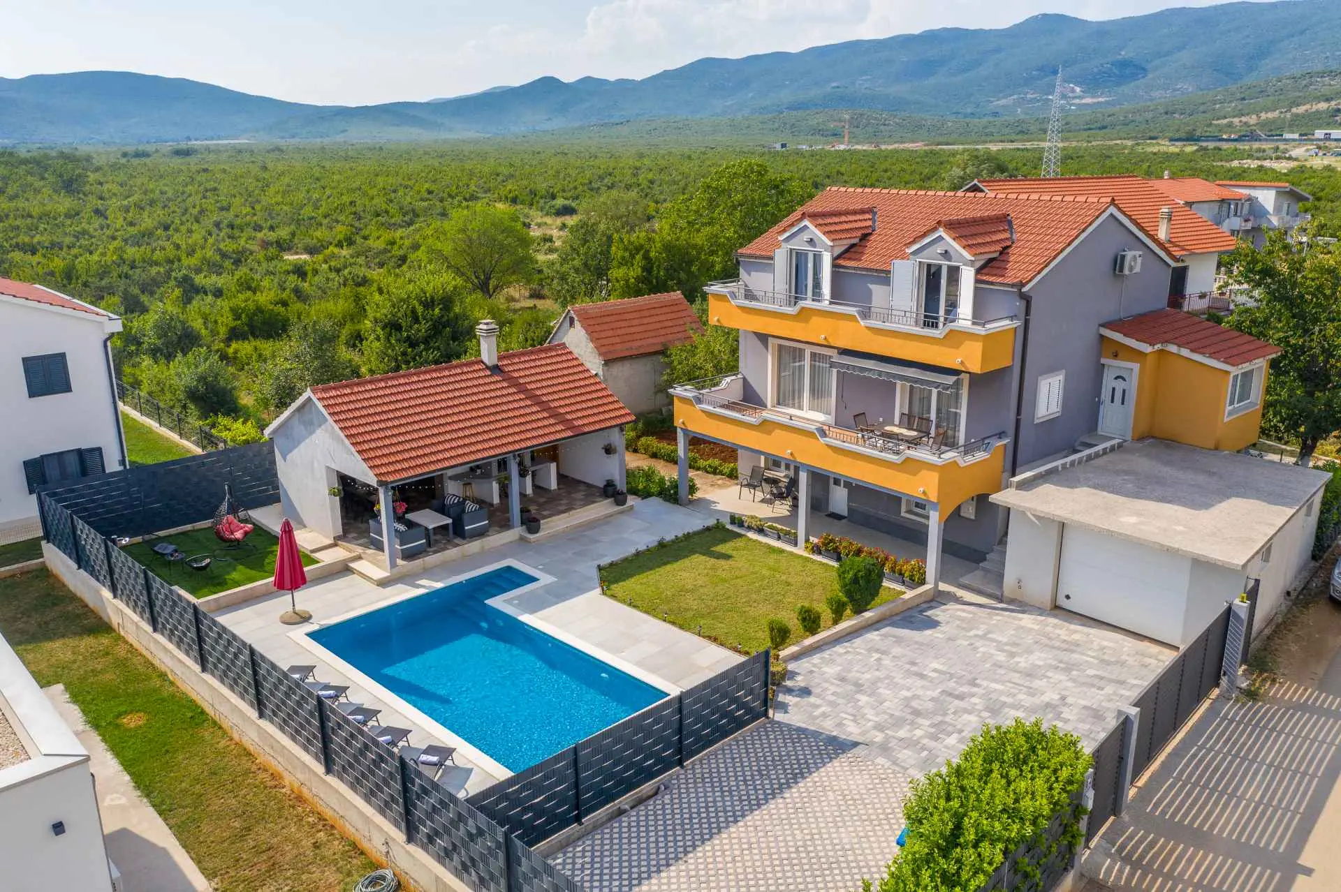 Nieruchomość jest w całości ogrodzona z zagospodarowanym ogrodem z zielonym trawnikiem. W centralnej części posesji znajduje się basen z leżakami, prysznic na świeżym powietrzu, kuchnia letnia (która wyposażona jest w kuchenkę, lodówkę, zmywarkę, czajnik, kostkarkę do lodu, barek do jedzenia, gotowania...) , grill dalmatyński, zestaw do spożywania posiłków, odpoczynku i toaleta. To właśnie w tej części posiadłości będziesz cieszyć się spotkaniami towarzyskimi. Odpręż się w najpiękniejszych chwilach spędzając czas z rodziną i przyjaciółmi, podczas gdy Twoje dzieci będą beztrosko bawić się na podwórku i pływać w basenie. Na pierwszym piętrze znajduje się duży salon z jadalnią i kuchnią z widokiem na basen i ogród, sypialnia z dużym łóżkiem oraz łazienka. na poddaszu znajdują się trzy ładnie urządzone pokoje, z czego dwa mają wyjście na balkon i łazienkę. Dom jest klimatyzowany, wyposażony w TV i Internet oraz posiada własny taras z leżakiem, na którym można cieszyć się spokojnym przebudzeniem, pięknym wschodem lub zachodem słońca, popijając gorącą kawę lub długi orzeźwiający napój.