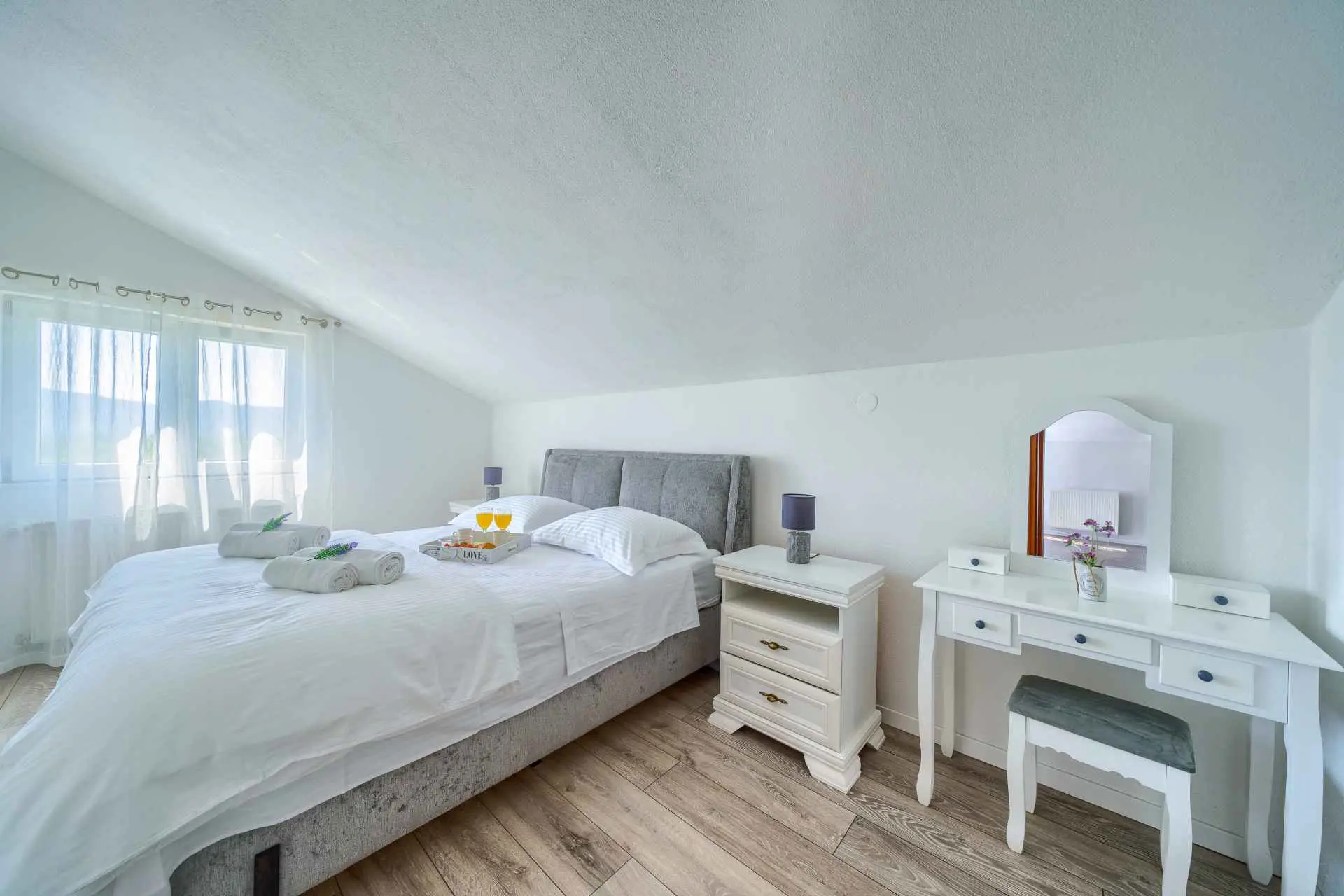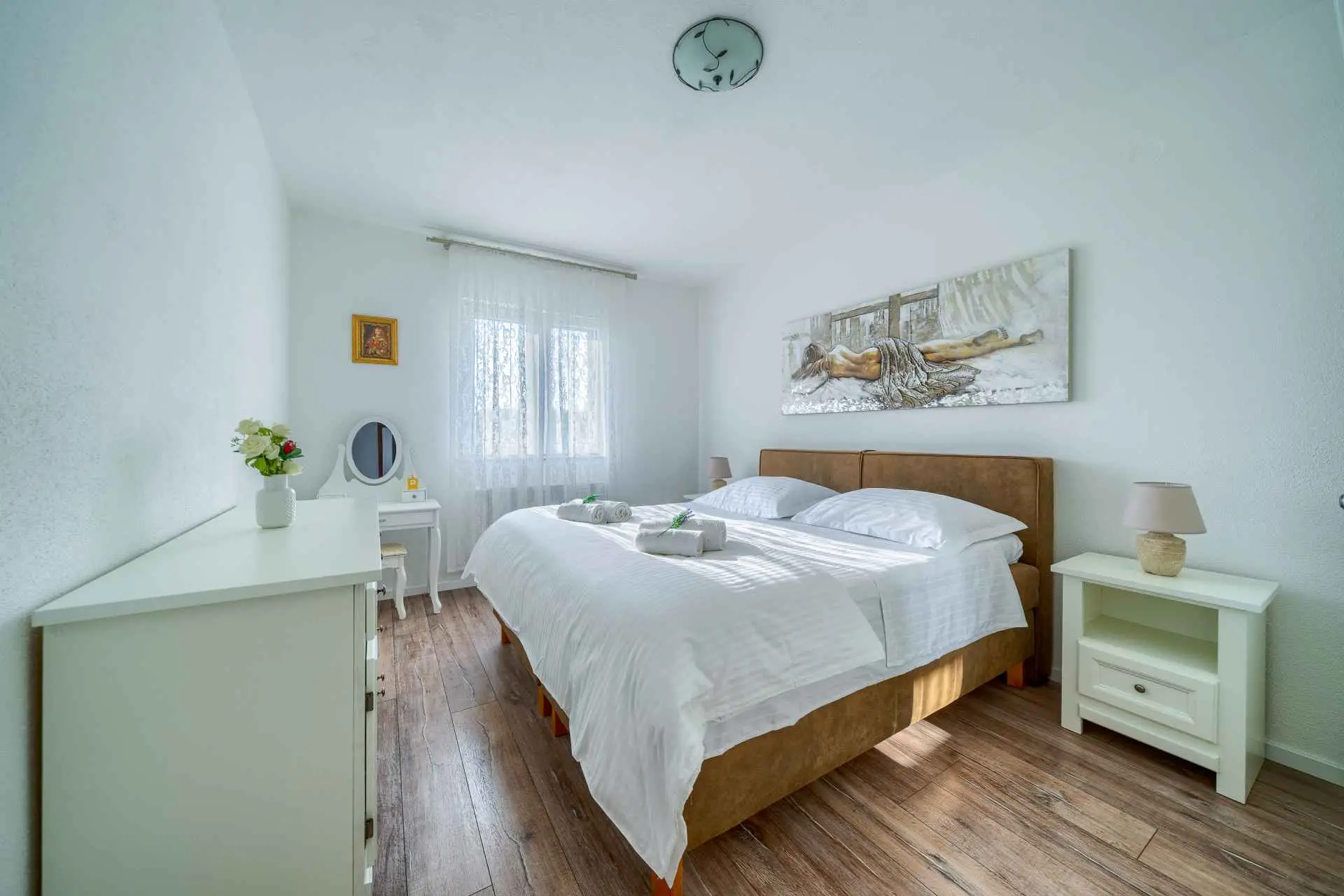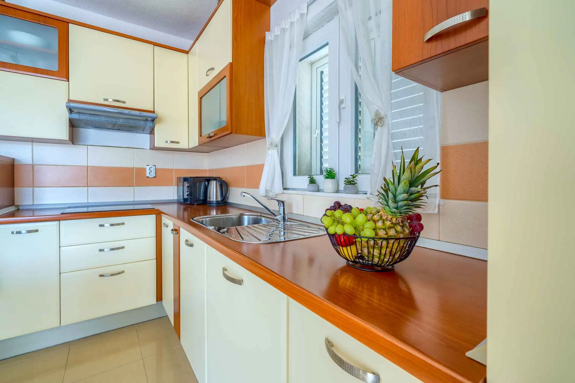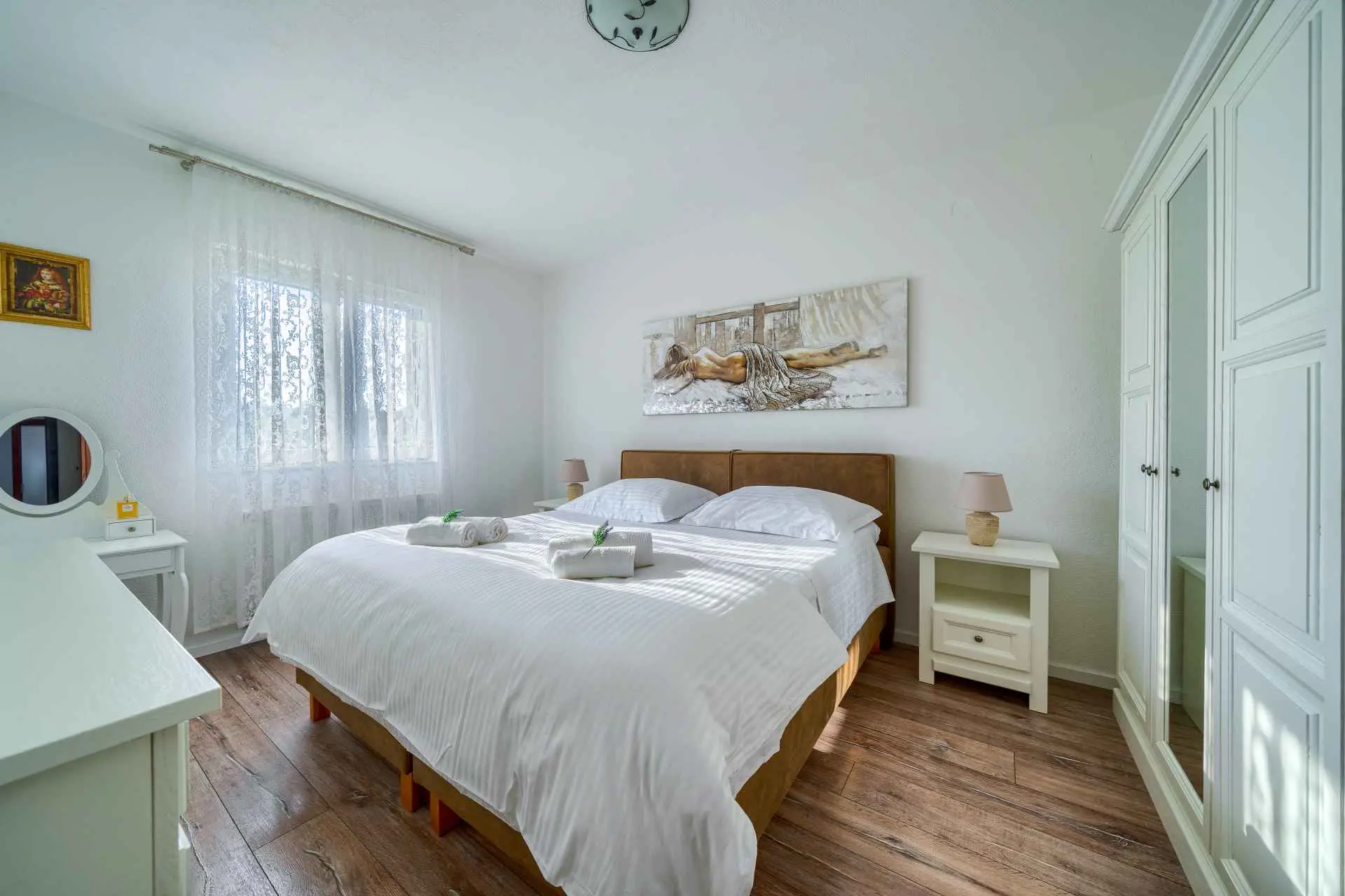Nieruchomość jest w całości ogrodzona z zagospodarowanym ogrodem z zielonym trawnikiem. W centralnej części posesji znajduje się basen z leżakami, prysznic na świeżym powietrzu, kuchnia letnia (która wyposażona jest w kuchenkę, lodówkę, zmywarkę, czajnik, kostkarkę do lodu, barek do jedzenia, gotowania...) , grill dalmatyński, zestaw do spożywania posiłków, odpoczynku i toaleta. To właśnie w tej części posiadłości będziesz cieszyć się spotkaniami towarzyskimi. Odpręż się w najpiękniejszych chwilach spędzając czas z rodziną i przyjaciółmi, podczas gdy Twoje dzieci będą beztrosko bawić się na podwórku i pływać w basenie. Na pierwszym piętrze znajduje się duży salon z jadalnią i kuchnią z widokiem na basen i ogród, sypialnia z dużym łóżkiem oraz łazienka. na poddaszu znajdują się trzy ładnie urządzone pokoje, z czego dwa mają wyjście na balkon i łazienkę. Dom jest klimatyzowany, wyposażony w TV i Internet oraz posiada własny taras z leżakiem, na którym można cieszyć się spokojnym przebudzeniem, pięknym wschodem lub zachodem słońca, popijając gorącą kawę lub długi orzeźwiający napój.